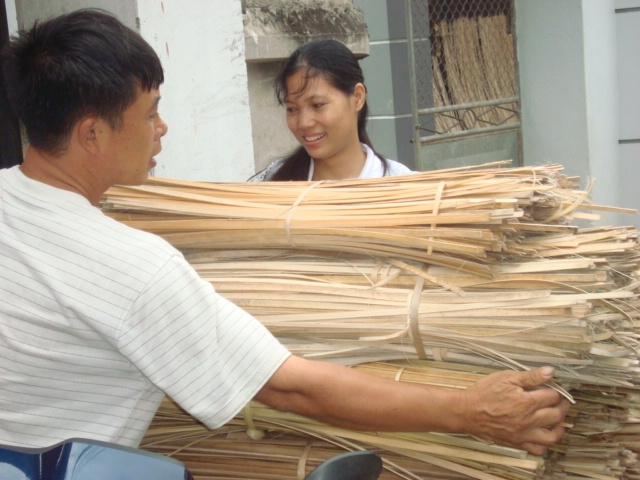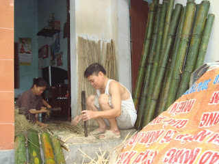 Bây giờ, mời bạn tham quan xóm 7, “thủ đô” của nghề làm vòng cái. Chưa đến gần, ta đã nghe thấy tiếng nổ lốp bốp, choang choác như tiếng pháo, cỡ pháo trung thời chính phủ chưa cấm. Đi bên tôi, hình như bạn hơi bất ngờ, đôi mắt đen láy mở to, vẻ ngỡ ngàng, hồn nhiên thốt lên: "Ôi! Pháo!". Không phải pháo đâu. Âm thanh vui tai đó phát ra từ công việc “pha” vòng đấy. Hiểu ra, đôi má bạn bỗng như ửng hồng, thoáng một chút e thẹn... Bởi, trước khi chuốt cho sợi vòng tròn, nhẵn, người lao động phải pha tre ra thành từng thanh, chiều dài thì như nhau, bằng kích thước của chiếc vòng cạp, còn chiều ngang, tùy thuộc tay nghề của người pha. Nếu pha khéo thì thép tre sẽ đều tăm tắp, trăm thép như một, chỉ nhỉnh hơn sợi vòng thành phẩm một chút, vừa dễ cho người vót, vừa nhanh xong, lại vừa đỡ tốn nguyên liệu. Không phải như tôi, lóng ngóng pha đơn thuần theo kiểu "nghiệp dư". Cứ hùng hục chẻ ống tre làm đôi, đôi thành bốn, bốn thành tám...mà được đâu. Pha thế thì có mà "lãi" hết, bỏ nghề đi cho sớm nhé. Phải lần lượt từng thanh, theo một cái ngữ mà thợ pha tre chỉ nhìn qua, đặt mũi dao vào đã đều như đo. Lại còn phải lựa tránh "lòng mặt" nữa, đừng tưởng dễ "ăn" nhé. Nhìn con dao lách theo tay bẻ rất dẻo của người pha, mà thấy thích mắt. Đây là công việc khá vất vả, thường do người đàn ông đảm nhiệm. Nhưng so với công việc chặt tre thì chưa thấm tháp gì...